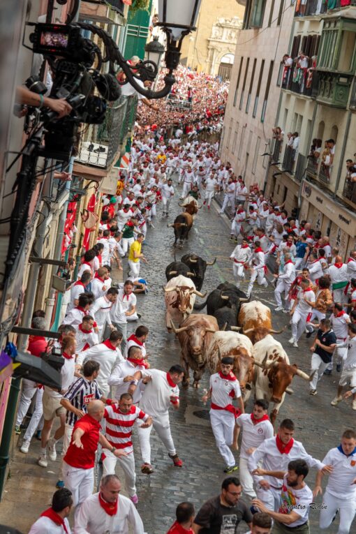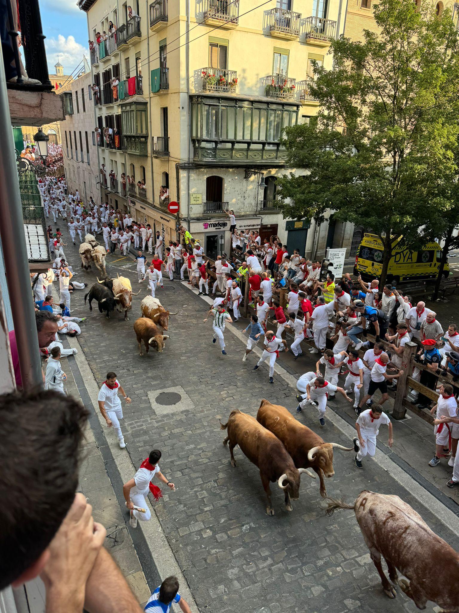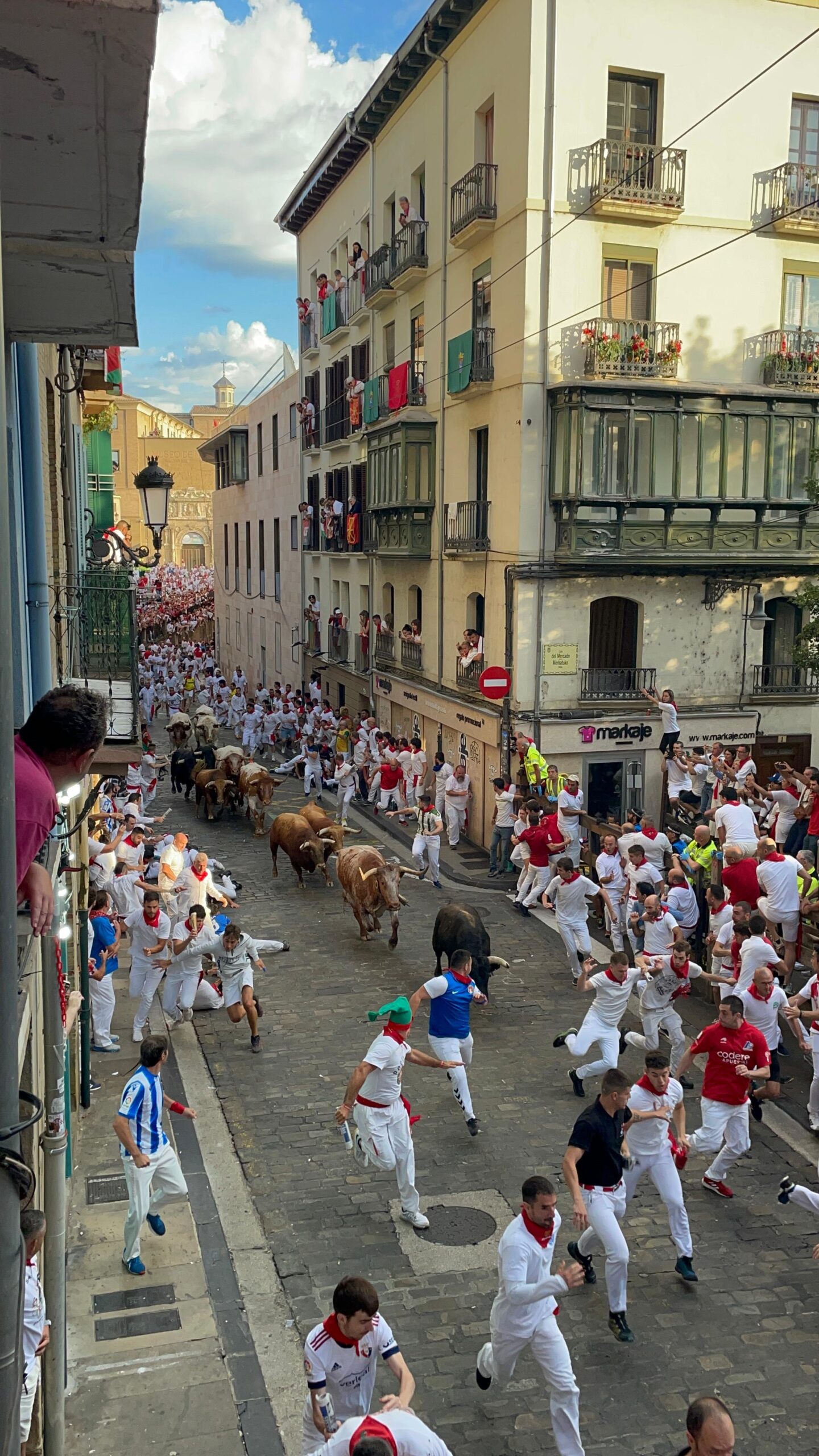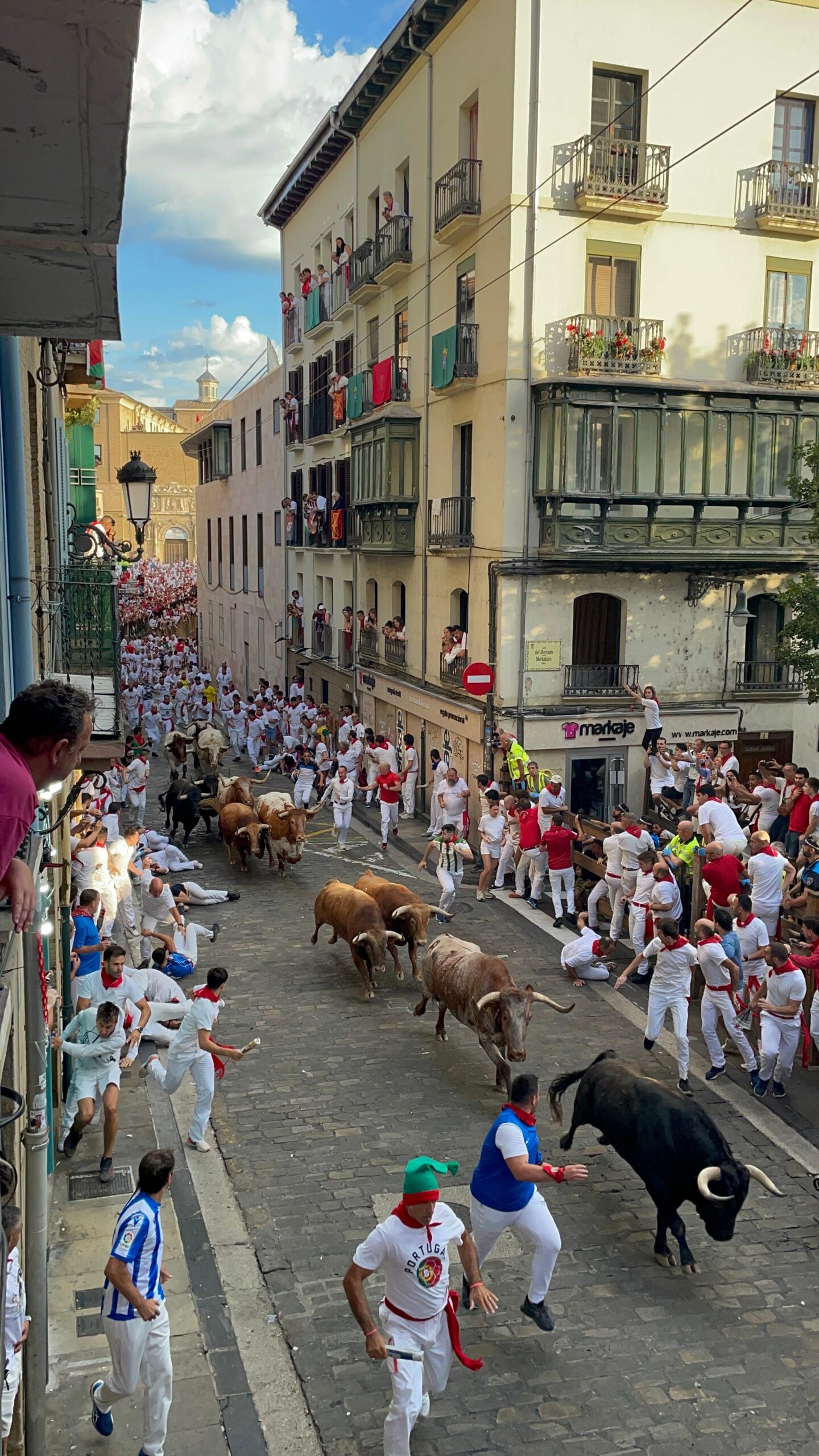 From here, you’ll witness the bulls at their most powerful. This is the very beginning of the run, where they blast up the hill with all their energy. And yes… you’ll feel the rush — the bulls are so close you could almost reach out and touch them. (Don’t worry, they’re not that close!)