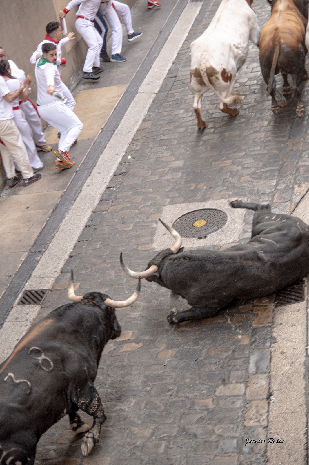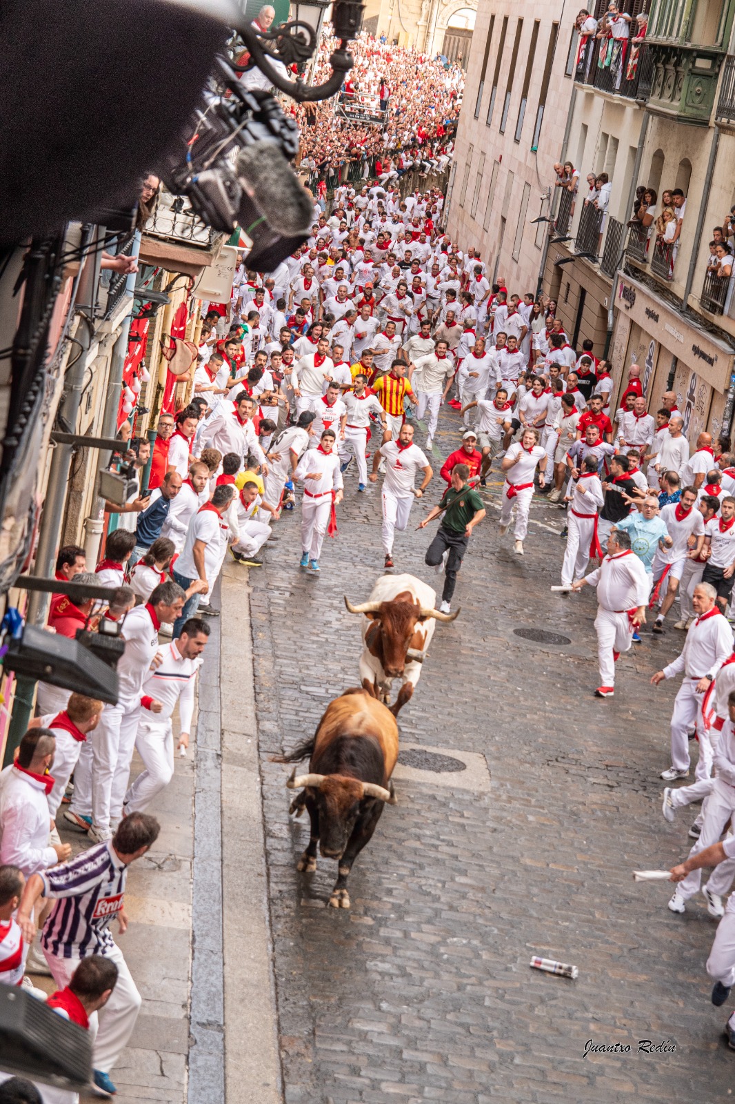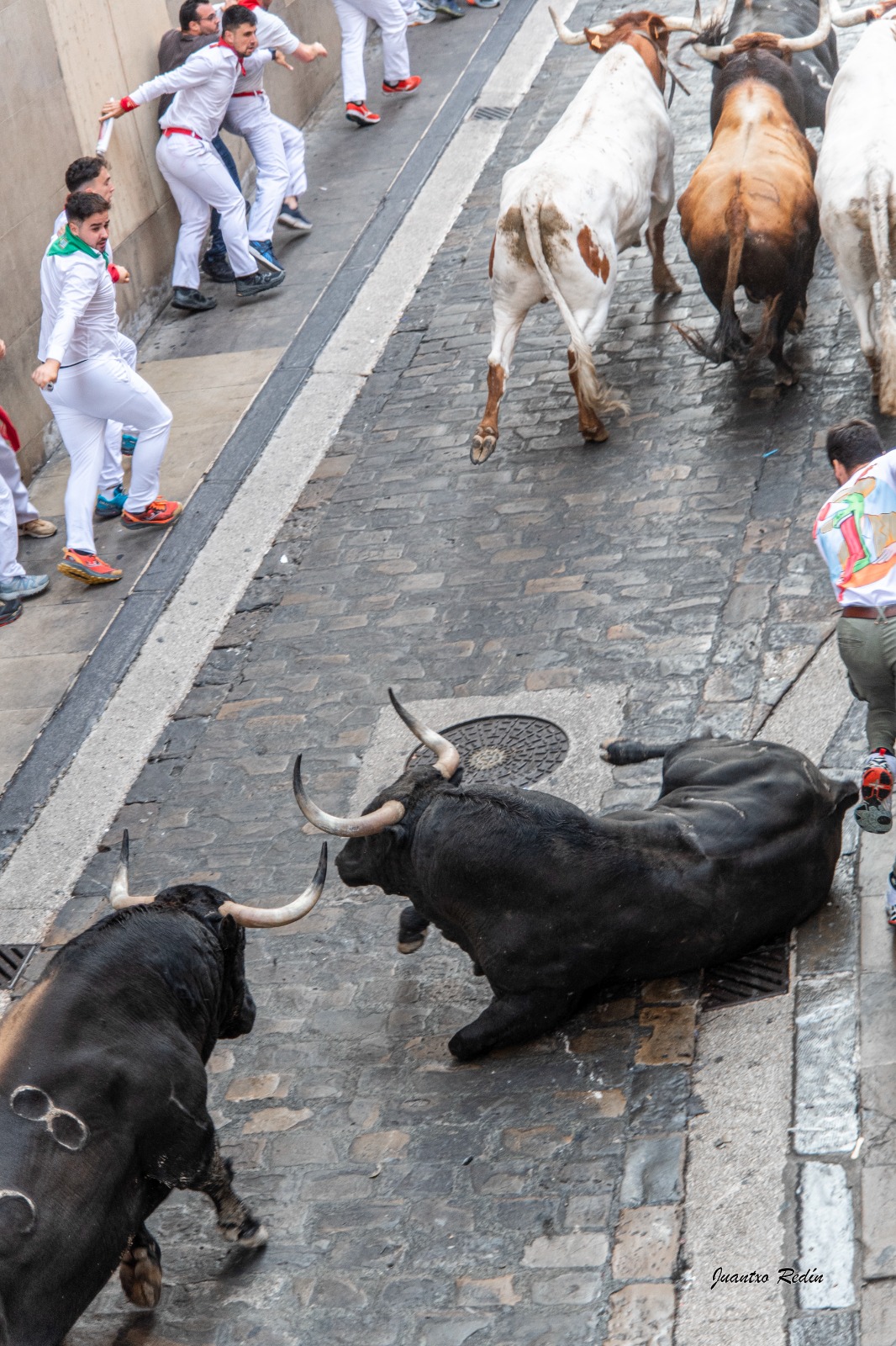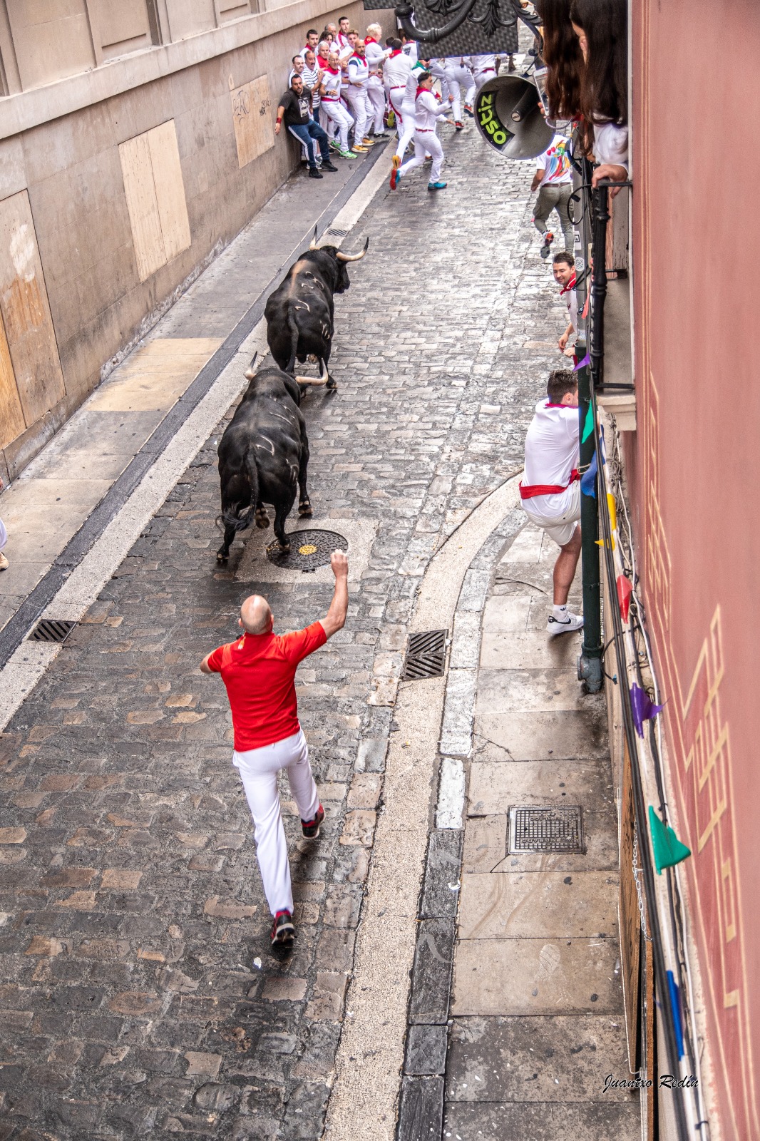 From here, you’ll witness the bulls at their most powerful. This is the very beginning of the run, where they blast up the hill with all their energy. And yes… you’ll feel the rush — the bulls are so close you could almost reach out and touch them. (Don’t worry, they’re not that close!)